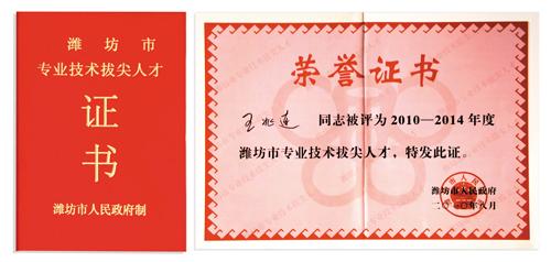 近日,公司董事長兼總經理王兆連被濰坊市人民政府評為2010-2014年度濰坊市專業技術拔尖人才。
