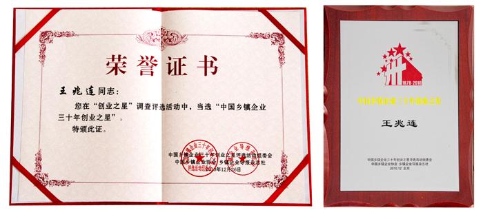 為表彰對(duì)鄉(xiāng)鎮(zhèn)企業(yè)發(fā)展做出突出貢獻(xiàn)的企業(yè)領(lǐng)軍人物,樹(shù)立行業(yè)典范,促進(jìn)鄉(xiāng)鎮(zhèn)企業(yè)持續(xù)健康快速發(fā)展,經(jīng)鄉(xiāng)鎮(zhèn)企業(yè)導(dǎo)報(bào)雜志社提名,人民日?qǐng)?bào)人民網(wǎng)、中國(guó)鄉(xiāng)鎮(zhèn)企業(yè)協(xié)會(huì)的大力支持,聯(lián)合首都多家新聞媒體,經(jīng)網(wǎng)絡(luò)民意初選,綜合評(píng)選組委會(huì)權(quán)威專家意見(jiàn),通過(guò)程序報(bào)請(qǐng)批準(zhǔn),公司董事長(zhǎng)兼總經(jīng)理王兆連被評(píng)為“中國(guó)鄉(xiāng)鎮(zhèn)企業(yè)三十年創(chuàng)業(yè)之星”。