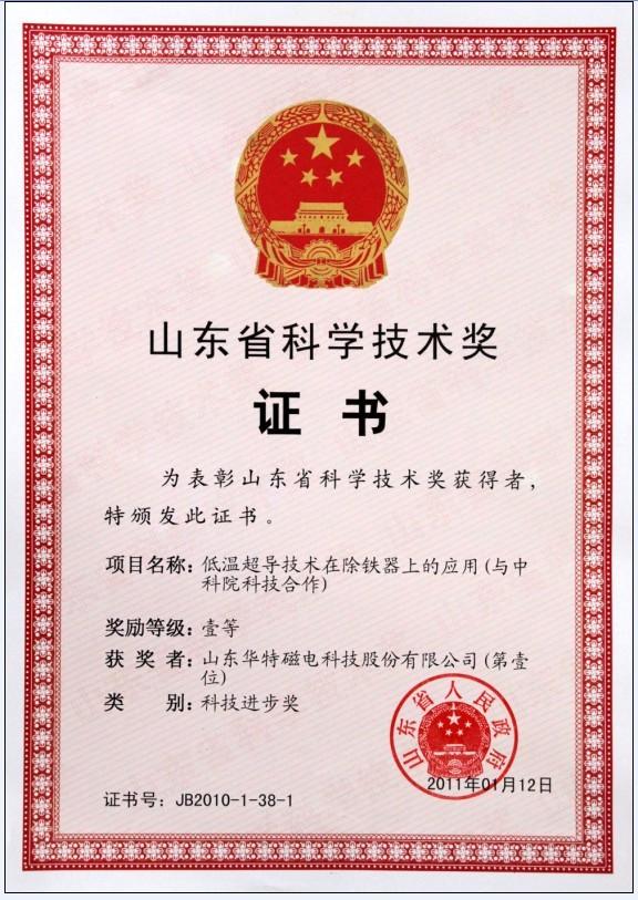 2月28日上午,山東省科學技術獎勵大會在濟南召開,表彰我省科技事業發展和現代化建設作出突出貢獻的科技工作者。省委書記、省人大常委會主任姜異康,省委副書記、省長姜大明等省委、省政府領導出席會議并為獲獎者代表頒發獲獎證書。我公司與中科院高能物理所合作研發的“低溫超導技術在除鐵器上的應用”榮獲山東省科技進步獎一等獎并受到表彰。
