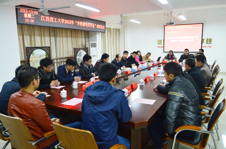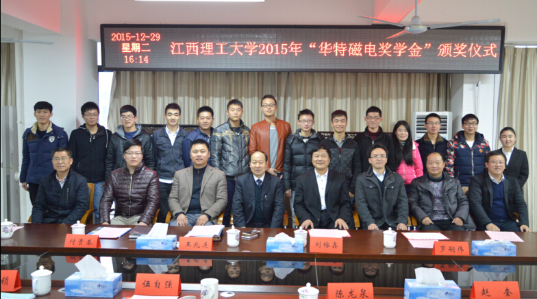 2015年12月29日,江西理工大學(xué)2015年度“華特獎學(xué)金”的在江西理工大學(xué)黃金校區(qū)逸夫?qū)嶒灅堑谝粫h室舉行頒獎儀式,山東華特磁電科技股份有限公司董事長王兆連、濰坊新力超導(dǎo)磁電科技有限公司選礦實驗室主任付貴泰應(yīng)邀出席,江西理工大學(xué)副校長伍自強(qiáng)教授、校團(tuán)委書記、學(xué)工部副部長汪鋒鎖、研究生院院長助理陳龍泉、資環(huán)學(xué)院黨委書記楊建永、院長趙奎、院黨委副書記熊淑華、2015年度“華特磁電獎學(xué)金”的全體獲獎同學(xué)參加了本次儀式。