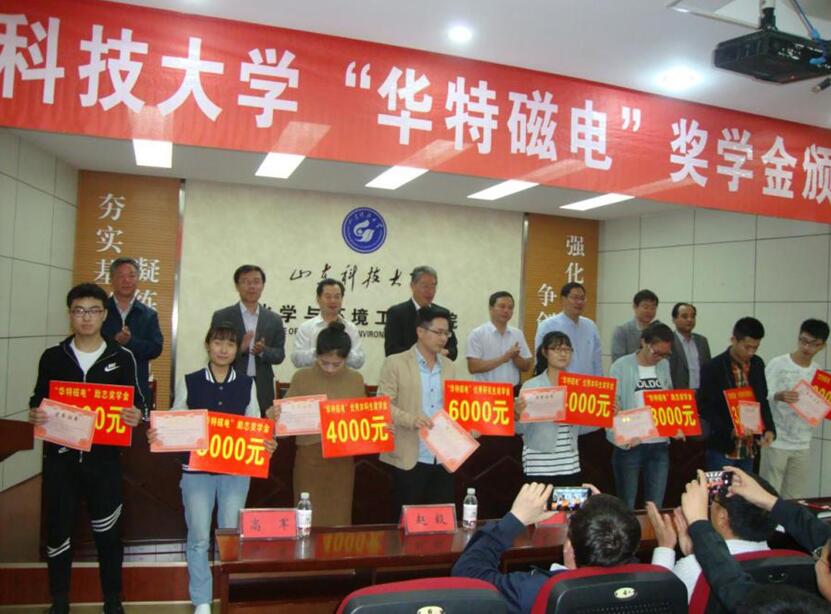 根據公司與山東科技大學簽訂的“華特磁電”獎學金使用辦法,本次獎學金發放給化學與環境工程學院的在校學生。這是公司在山東科技大學頒發的第二屆“華特磁電”獎學金。山東科技大學黨委副書記李道剛,學生工作部、校團委、教務處、合作發展處、化工學院負責人出席會議,會議由化工學院黨委副書記竇存增主持。獲獎學生以及礦物加工工程系教師、研究生、本科生代表參加會議。